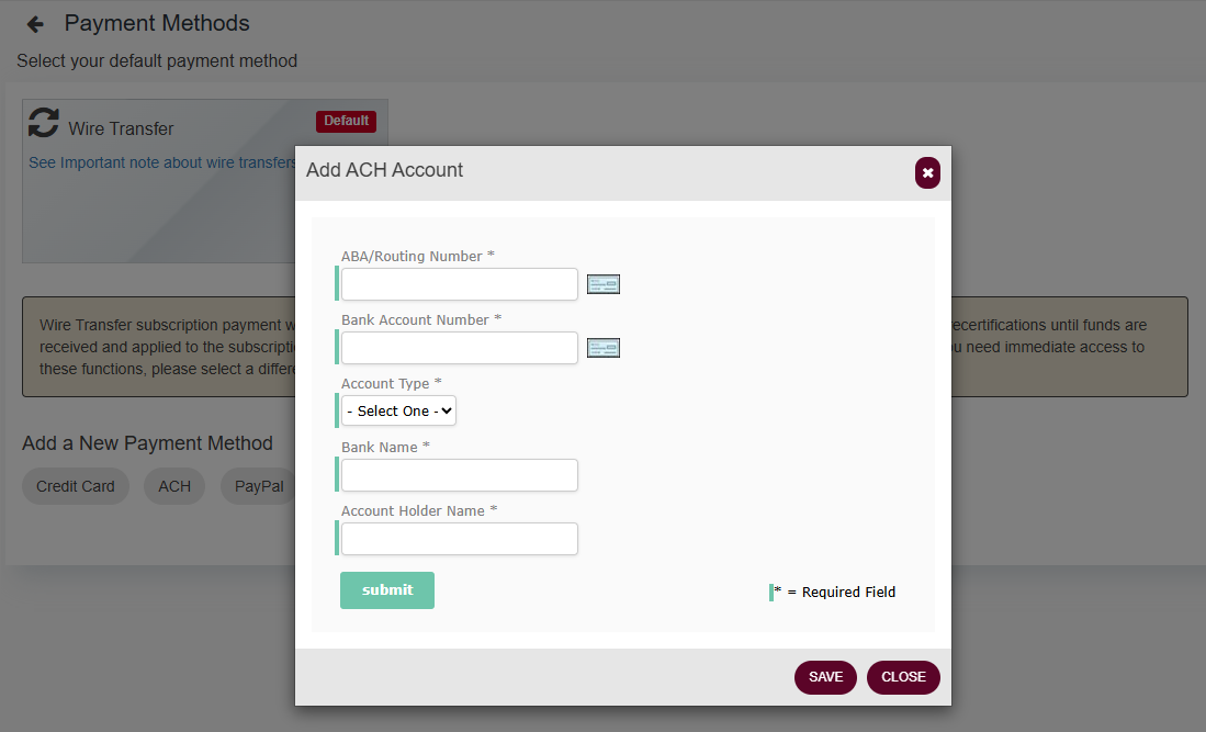 3. Click Add New Payment Method and select ACH.