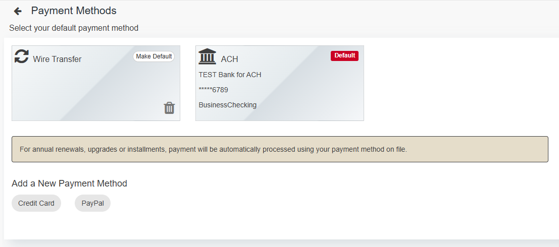 6. Once validated, set ACH as your default by selecting Make Default.