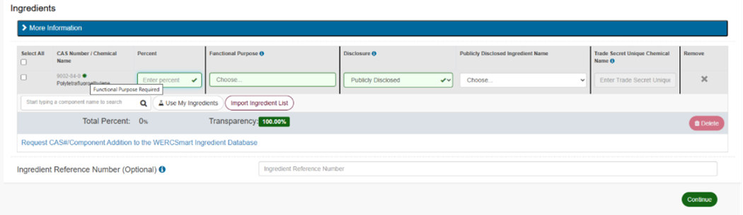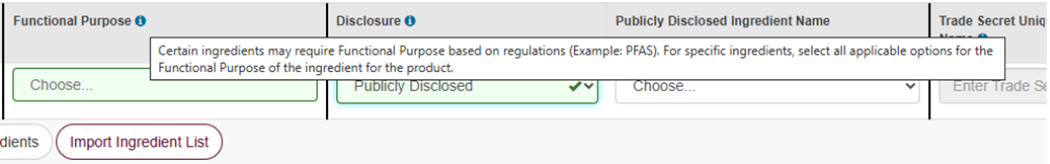 We have included a helpful hover for Functional Purpose. A functional purpose is why the chemical is included in the product due to providing some type of benefit or functionality within the product. This could be options such as diluent, lubricants, propellants, and many others.