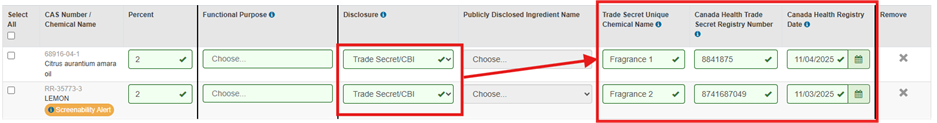 Canada requires the registry number issued by Health Canada for any chemical indicated to be Trade Secret, when SDS authoring will be done by UL Solutions. The Health Canada registry date is also required. See the example above.