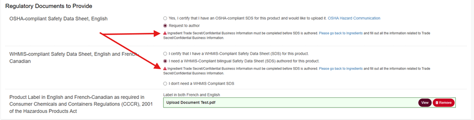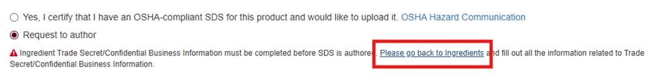 When you indicate you need SDS authoring services, later in the registration, you will see an error message advising that you must go back to the ingredient area to provide further details. Here’s the example of the error: