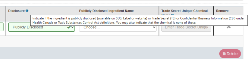 - When indicated to be publicly disclosed, you will need to select the publicly disclosed ingredient name in the ingredient table.